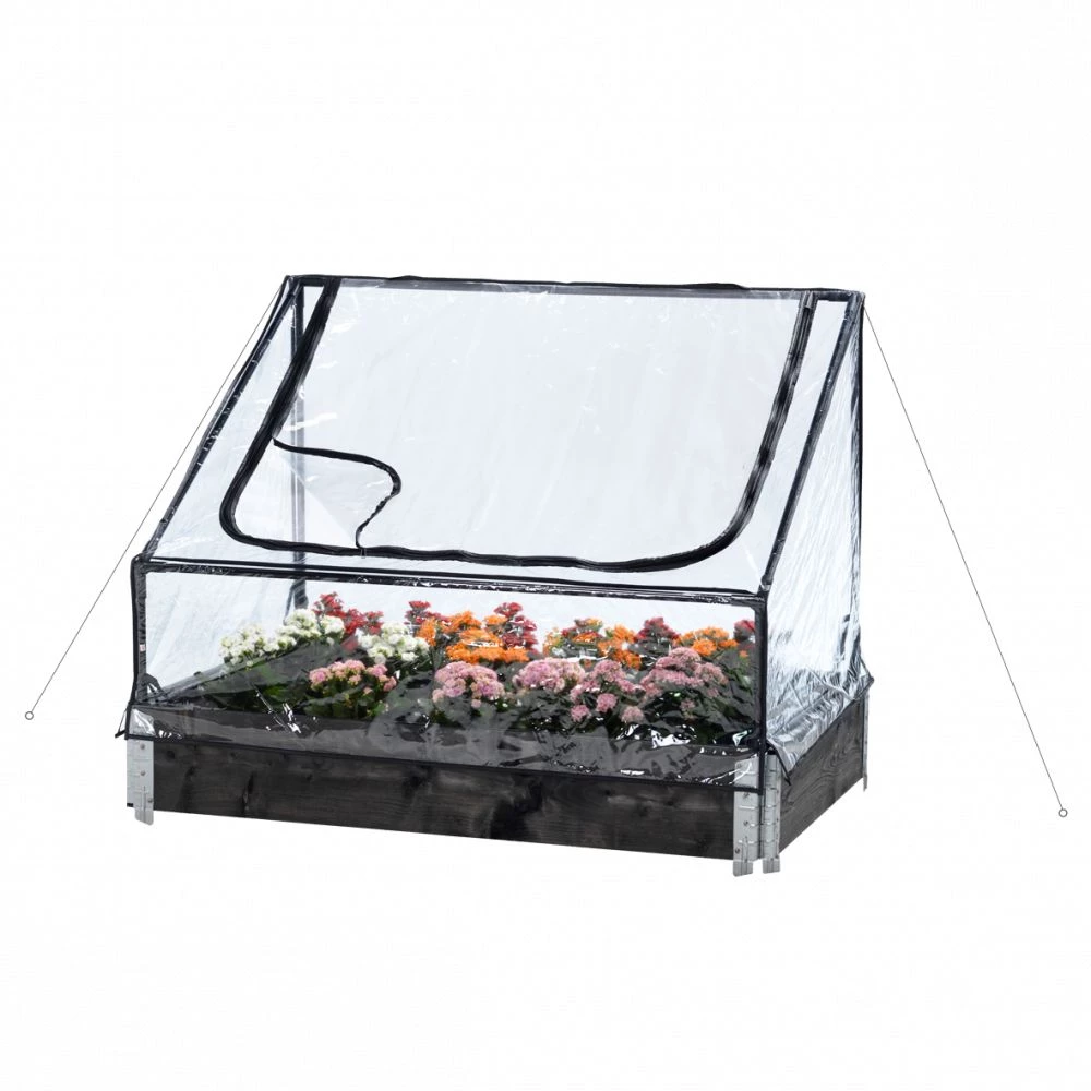 Væksthus til højbed.Fremstillet i plastik og syet med sorte kantbånd. Stel fremstillet i antracitgrå metalrør. Overtrækket har to separate lynlåse – en til åbning af insektnettet og en til åbning af overtrækket. På denne måde kan der ventileres uden uønskede insekter får adgang til væksthuset.