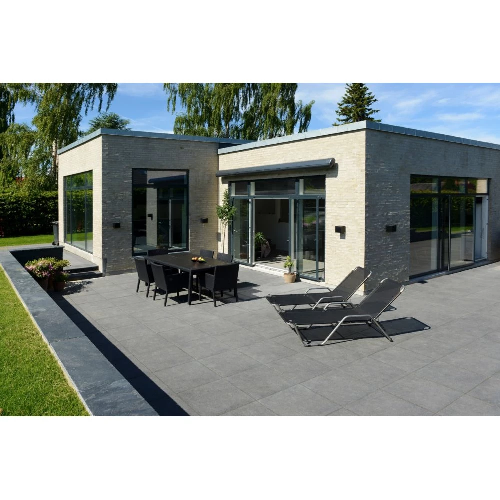 En revolution indenfor for betonfliser, da den giver det optimale rustikke look til de forbrugere der ønsker granittens overfladelook, men betonens styrke. Overfladebehandlet, så den passer optimalt til det danske vejr. Sort flammet. 40×40×4 cm