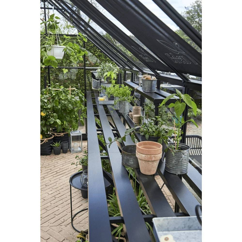 Til dit Halls Qube+ 816 drivhus finder du her det originale og smarte drivhusbord / plantebord i sort, der i design og størrelse passer perfekt til drivhuset.