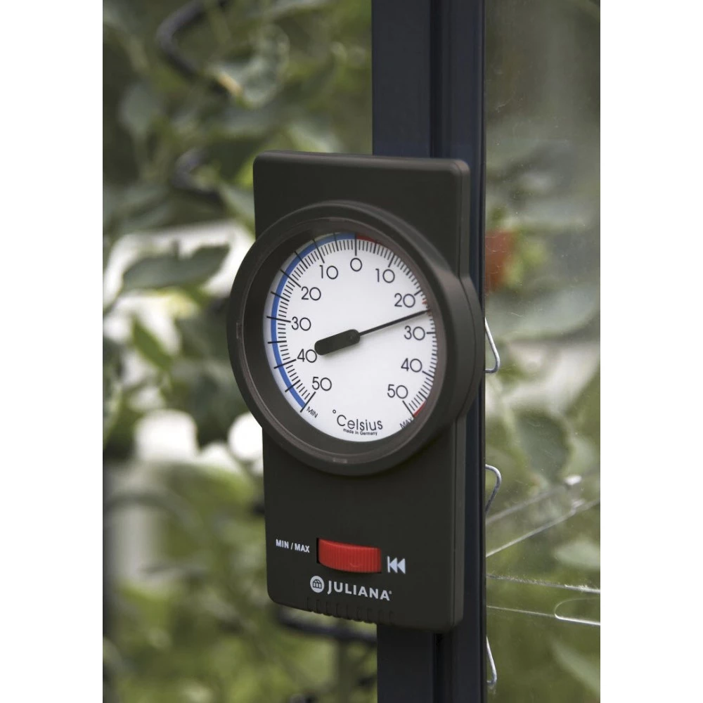 Et rigtig godt instrument til indstilling af varmen i drivhuset. Man kan aflæse den aktuelle temperatur, samt den koldeste og varmeste temperatur der har været i drivhuset siden sidste aflæsning.