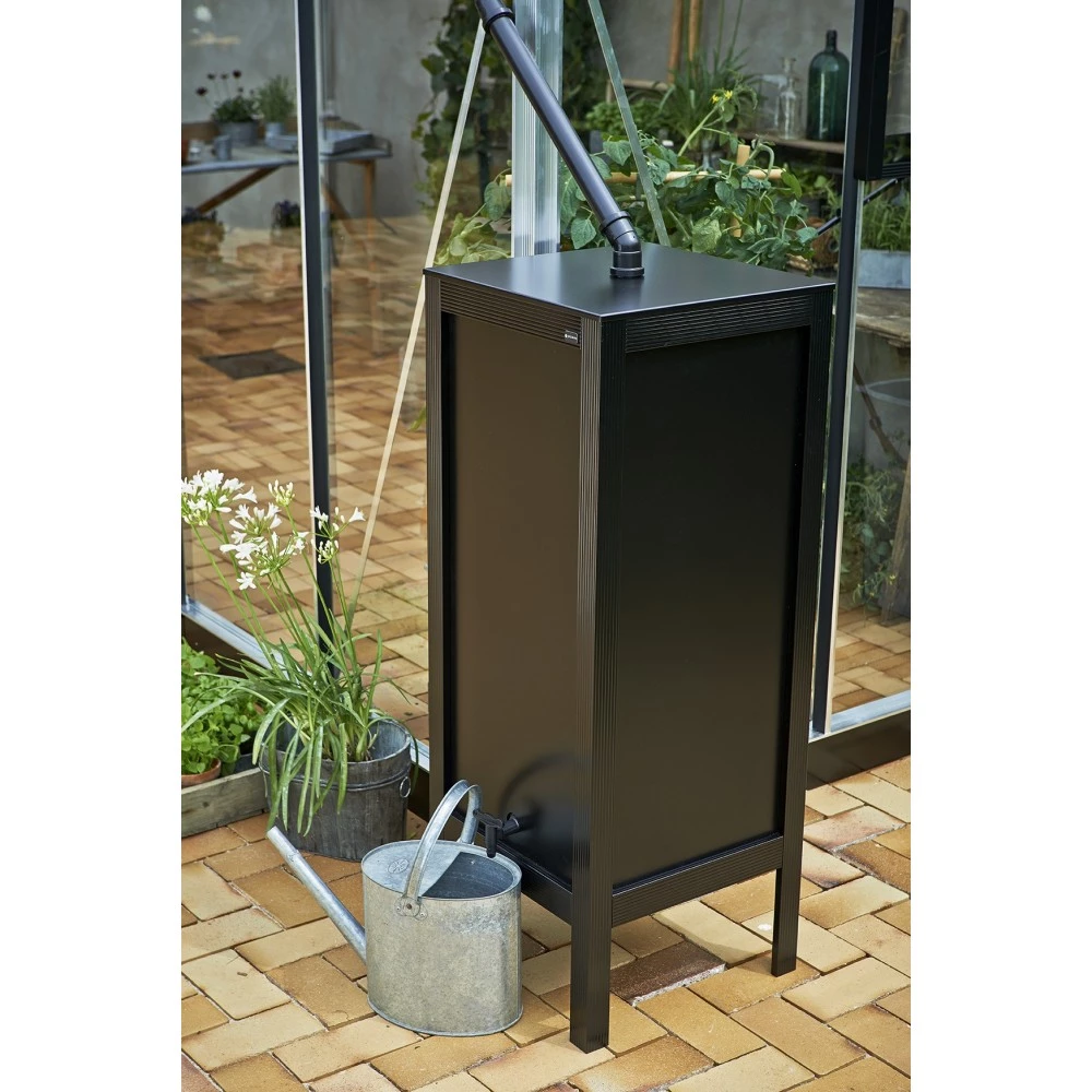 100 liter regnvandstønde i flot design, som kan tilsluttes drivhusets tagrende med en praktisk tappehane nederst.