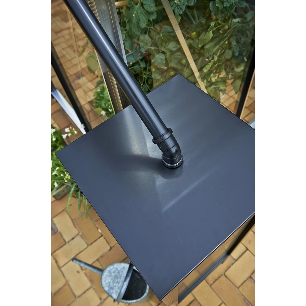 Regnvandstanken kan tilsluttes drivhusets tagrende og samler vandet sammen til senere brug. Med den lille hane for neden, kan du nemt fylde en vandkande med det kalkfri regnvand.